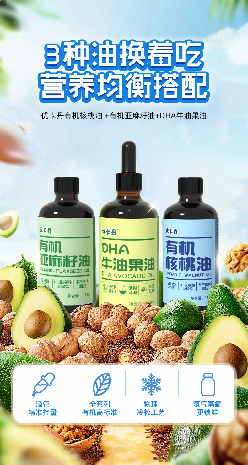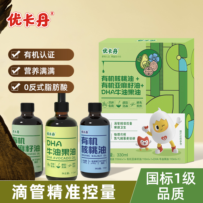 【產(chǎn)品名稱】優(yōu)卡丹有機(jī)核桃油+有機(jī)亞麻籽油+DHA 牛油果油