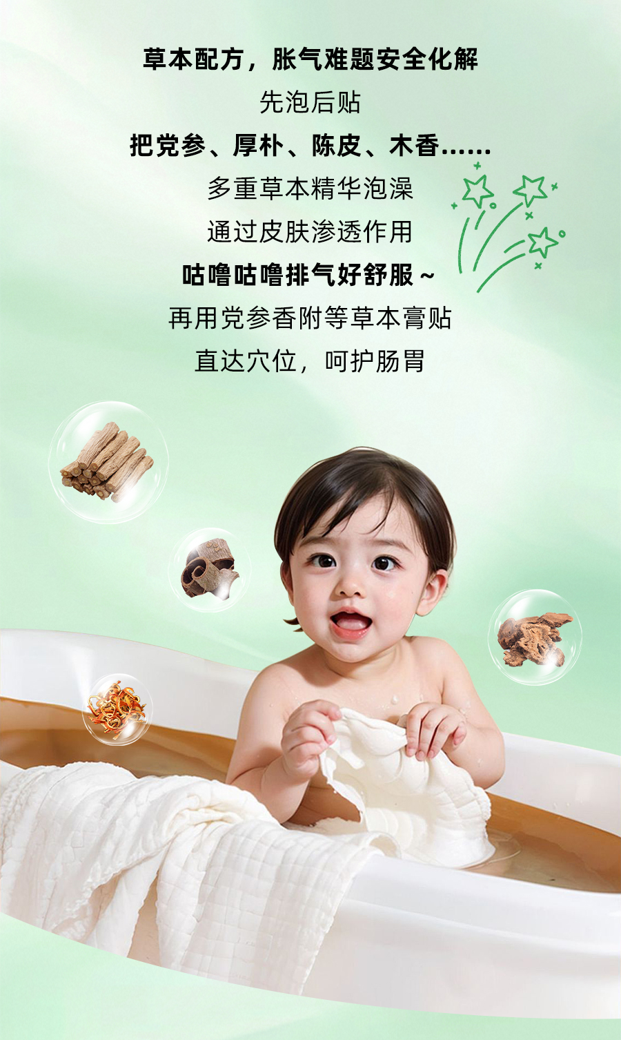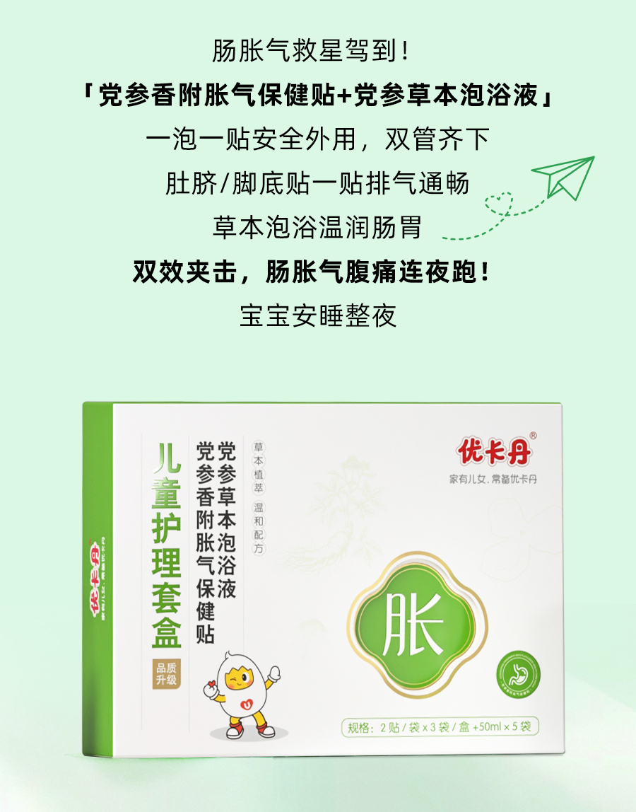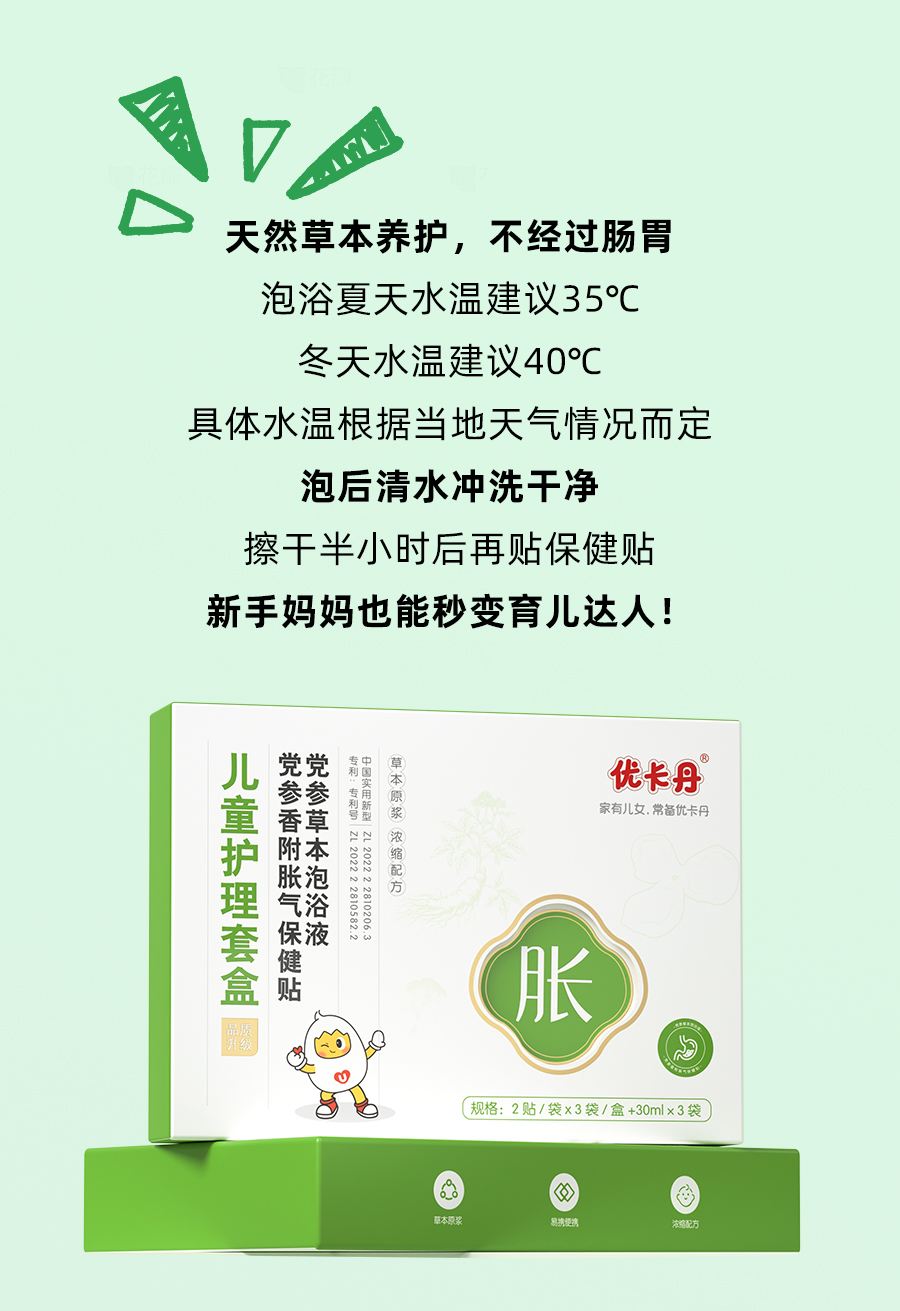 【產品名稱】優卡丹兒童草本脹氣護理套盒(黨參香附脹氣保健貼、黨參草本泡浴液)