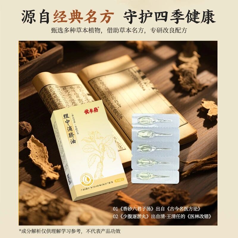 優卡丹理中滴臍油的配方靈感,就源自兩部中醫典籍中的名方:一是出自《古今名醫方論》的《香砂六君子湯》,歷來被視作呵護脾胃的經典;二是清?王清任《醫林改錯》里的《少腹逐淤丸》,在護理身體循環方面頗有講究。