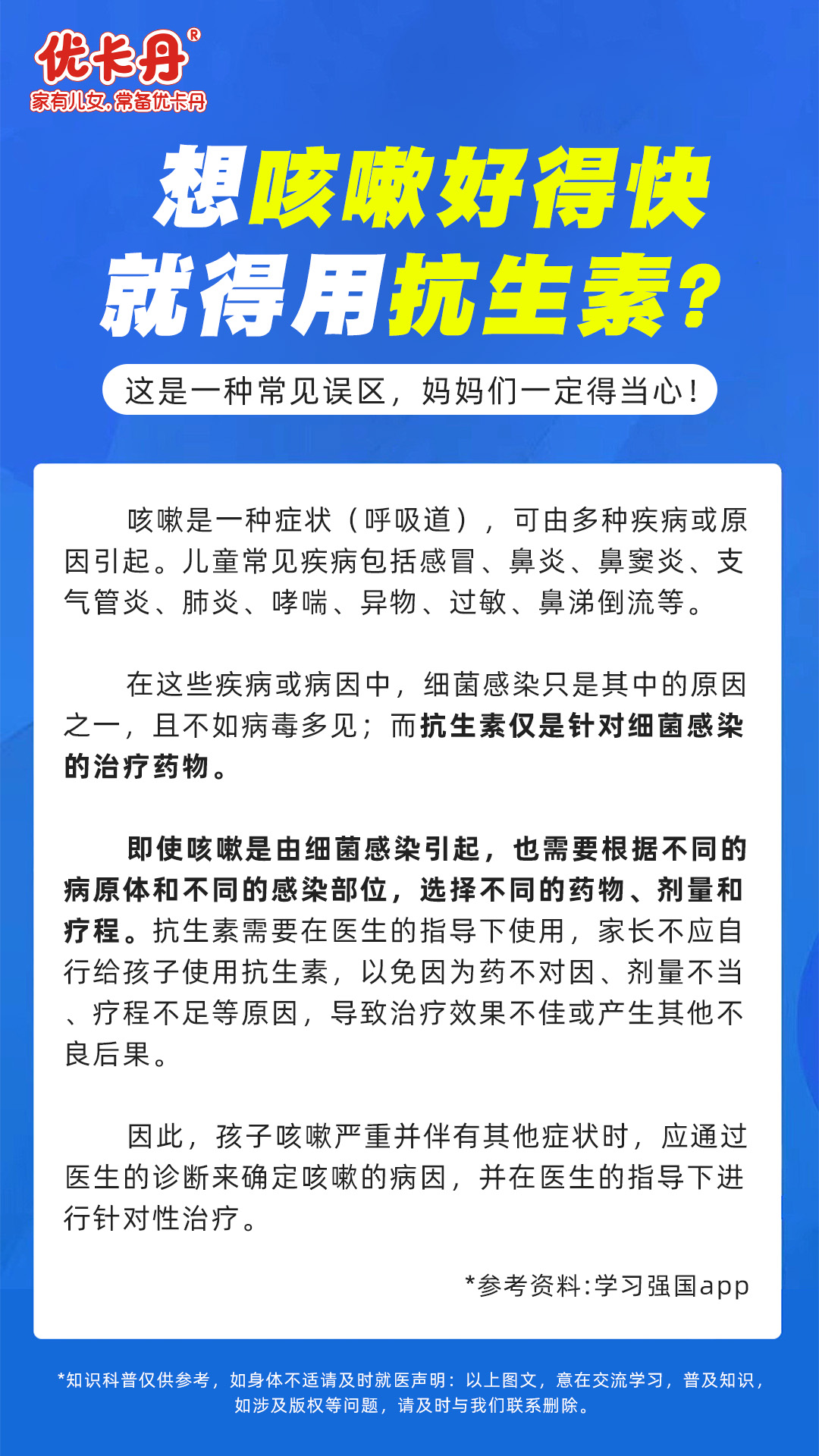 咳嗽時盲目依賴抗生素,可能會掩蓋真實病因、延誤治療時機。建議轉發提醒身邊愛囤抗生素的親友,共同樹立科學用藥意識,避免陷入用藥誤區。關注優卡丹,帶你了解更多正確的育兒知識。