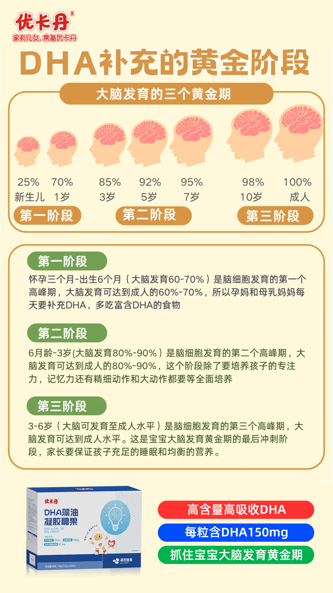 DHA補充圖解|一張圖帶你了解補充DHA的關鍵期 發布時間:2025-11-05 11:23:13 瀏覽量:26 您知道嗎?寶寶大腦發育的黃金期,一生只有一次。從出生到3歲,大腦發育將完成成人大腦的近90%,這是一個不可逆的迅猛過程。在此階段為寶寶及時補充足量的DHA,就如同為他鋪設最關鍵的“聰明基石”,這份早期的營養投入,將轉化為他未來探索世界的無限潛能。家有兒女,常備優卡丹。